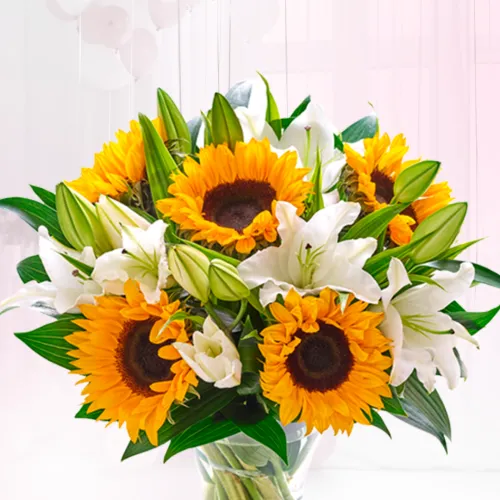 • Стандарт - роза- 7 шт., подсолнух -3 шт., зелень, упаковка,лента