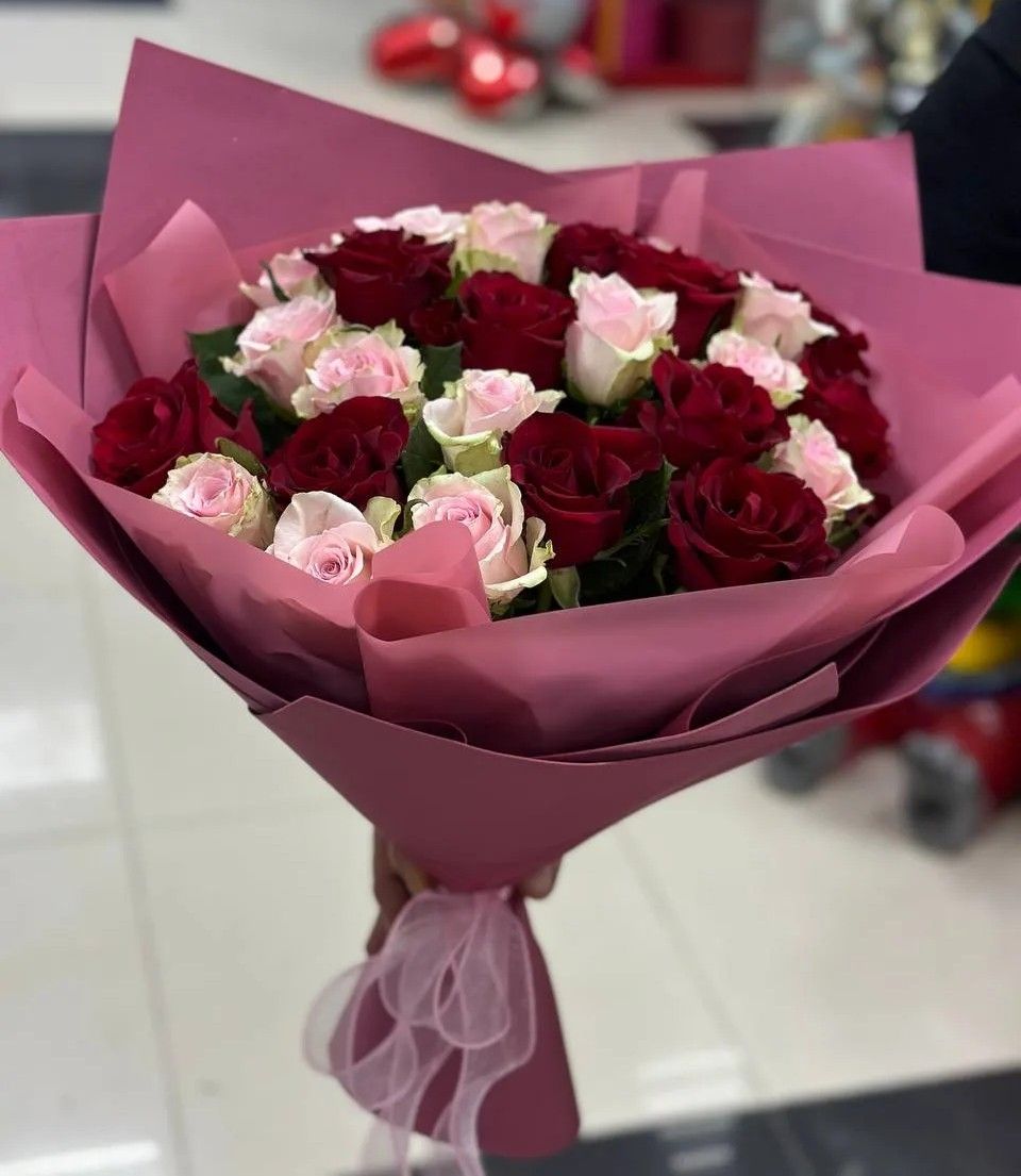 25 красных и розовых роз - яркий и нежный букет, который расскажет о чувствах без слов и подарит незабываемые эмоции!