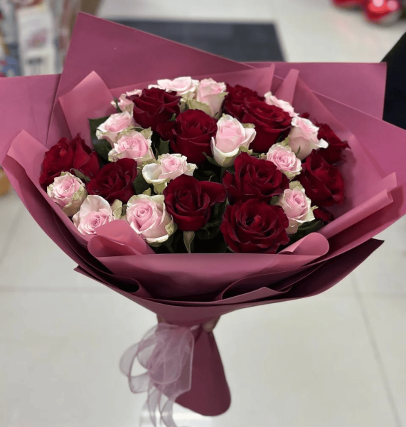 🌹🌸 Букет из 25 красных и розовых роз в стильной упаковке - это гармоничное сочетание страсти, нежности и искренних чувств. Яркие красные розы символизируют любовь и восхищение, а утончённые розовые бутоны передают заботу, нежность и тепло. Вместе они создают эффектную композицию, которая выглядит роскошно и запоминается с первого взгляда.