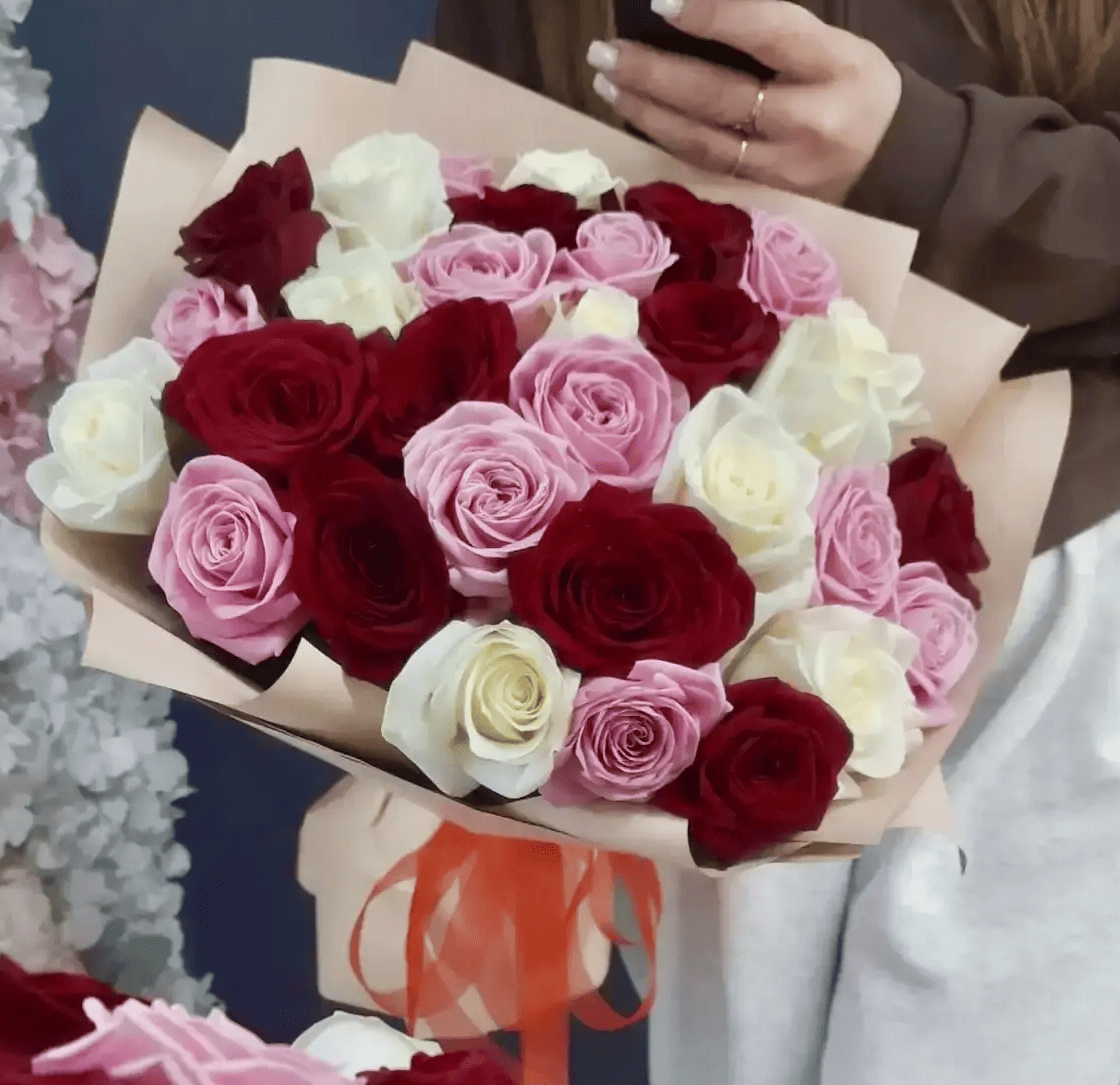 Роскошный букет из 31 розы в красных, белых и розовых оттенках в стильной упаковке - это гармония чувств, красоты и изысканного вкуса. Глубокие красные розы передают страсть и любовь, нежные розовые - заботу и тепло, а белые - чистоту и искренность. Вместе они создают выразительную, многослойную композицию, которая выглядит эффектно и торжественно.