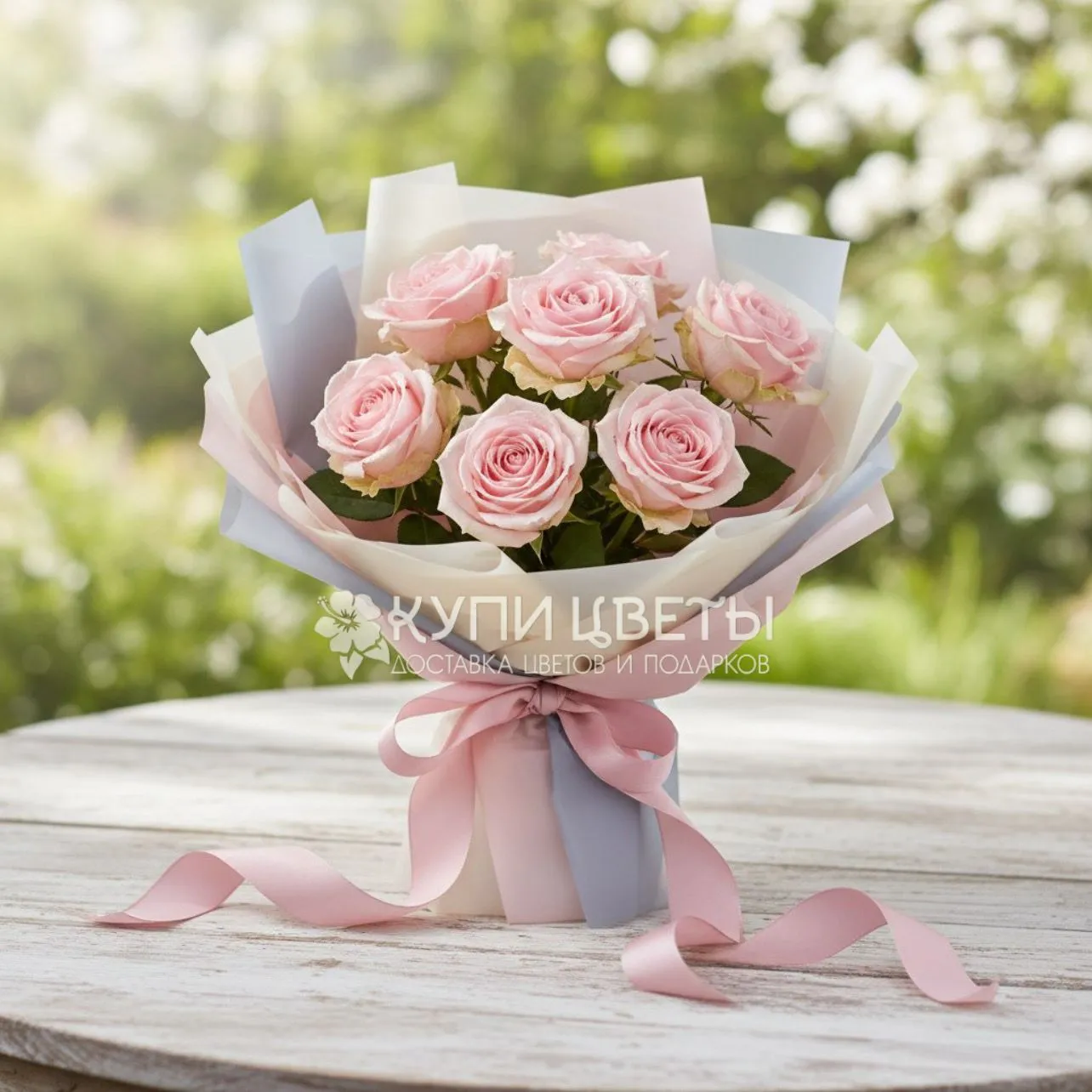 Розовые розы 7 шт., упаковка, лента |