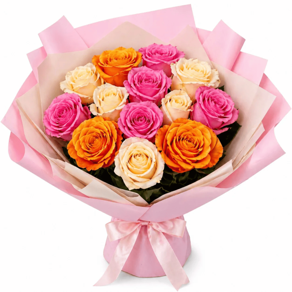 Букет из 13 разноцветных роз - это живая палитра эмоций, собранная в одной стильной композиции. Нежные кремовые, сочные оранжевые и романтичные розовые оттенки гармонично сочетаются между собой, создавая эффектный, радостный и по-настоящему праздничный букет.