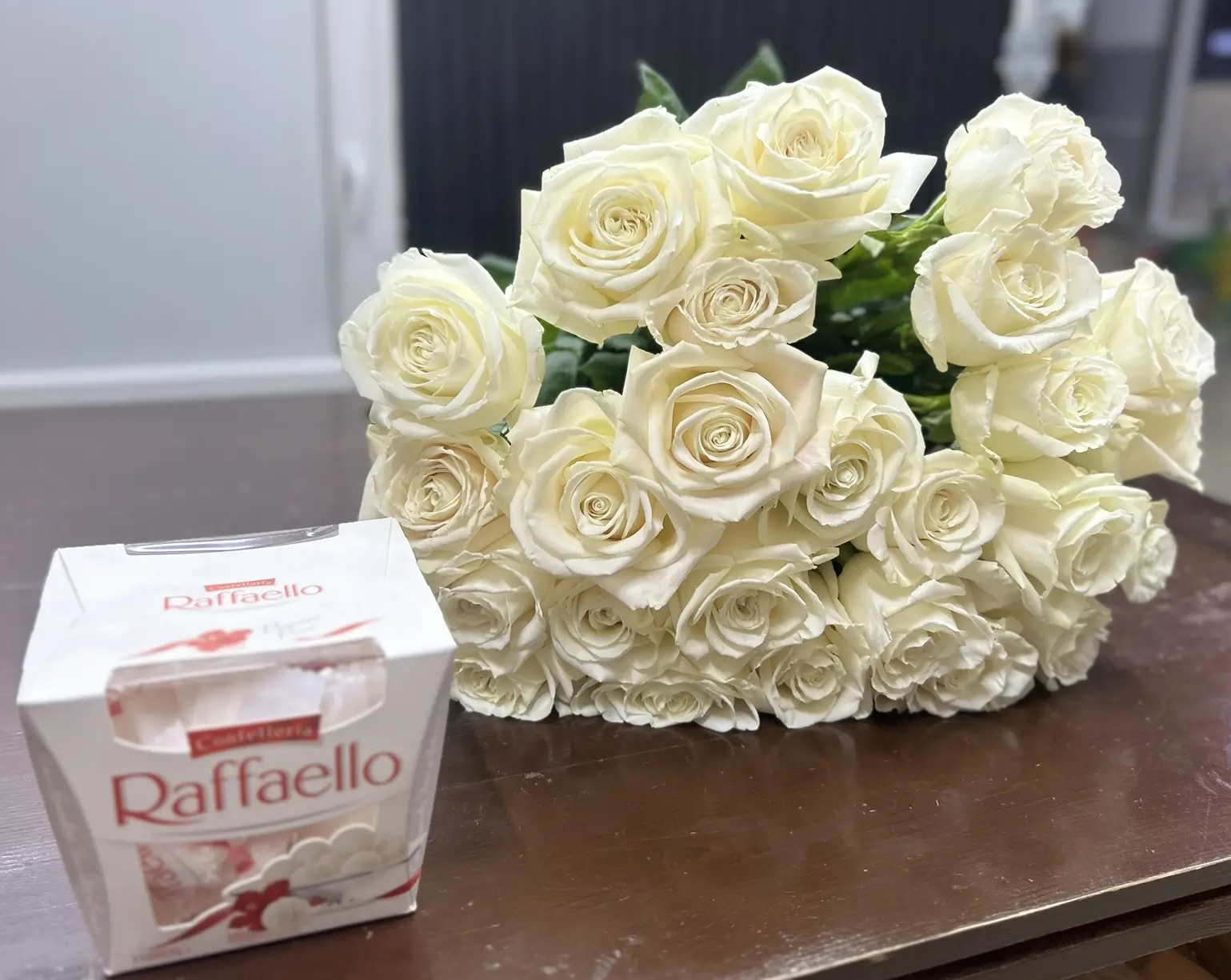 Нежный букет из белых роз - символ искренности, чистоты и утончённой любви.