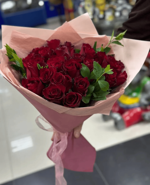 Роскошный букет из 25 красных роз с зеленью в стильной упаковке - это яркое воплощение любви, страсти и искренних чувств. Бархатные алые бутоны выглядят эффектно и торжественно, а свежая декоративная зелень подчёркивает насыщенный цвет роз, добавляя композиции объём, свежесть и природную гармонию.