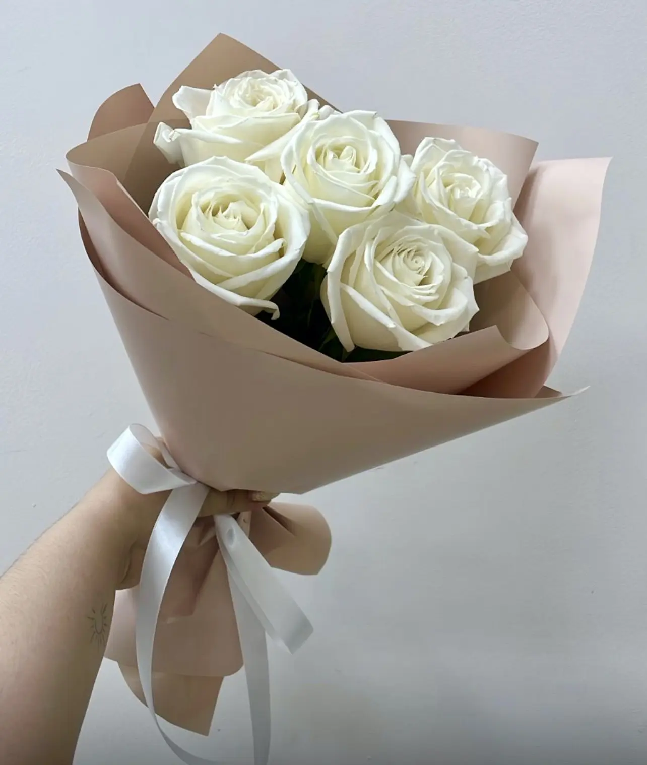 Нежный букет из 5 белых роз в стильной упаковке - лаконичное и изысканное выражение искренности и чистых чувств. Белоснежные бутоны с бархатистыми лепестками выглядят утончённо и благородно, создавая атмосферу лёгкости и гармонии. Минималистичное оформление подчёркивает природную красоту роз, делая букет элегантным и универсальным подарком для любого случая - от тёплого комплимента до важного события.