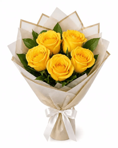 роза-5шт, зелень, упаковка, лента |