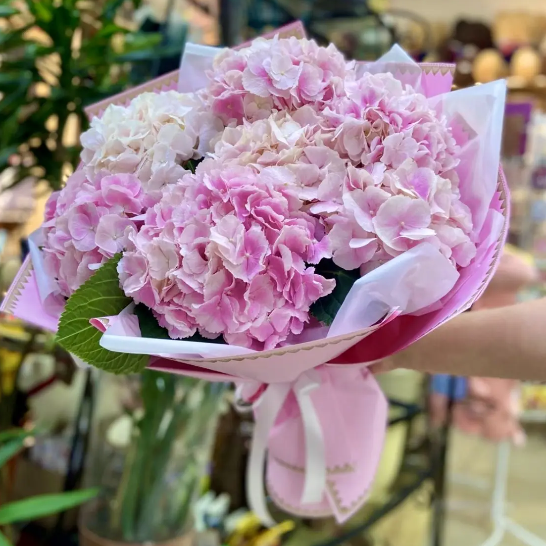 Нежный букет из розовой гортензии в стильной упаковке - воплощение утончённой романтики и воздушной красоты. Крупные, пышные соцветия с мягким розовым оттенком создают эффект лёгкого облака, наполняя композицию объёмом и особым шармом. Гортензия выглядит изысканно и современно, а аккуратная упаковка подчёркивает её природную элегантность. Такой букет станет прекрасным подарком для выражения тёплых чувств, заботы и искреннего внимания.