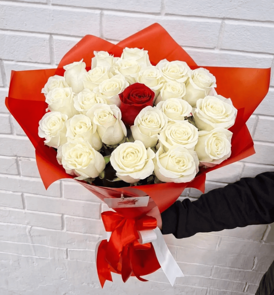 Изысканный букет из 24 белых роз с одной красной розой в центре - это утончённая композиция с глубоким смыслом, где нежность встречается со страстью