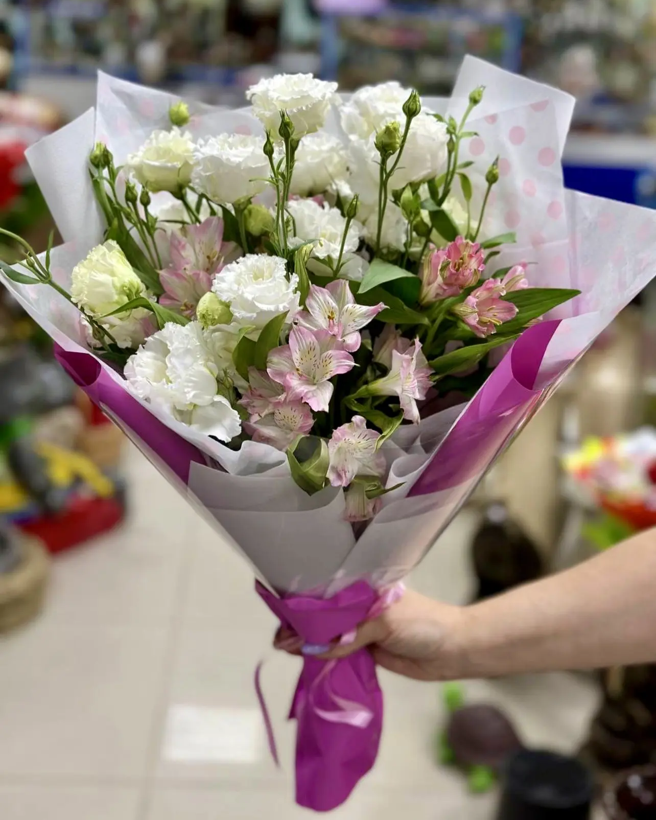 Нежный и утончённый букет, в котором белая махровая эустома создаёт ощущение лёгкости и воздушной роскоши, а розовая альстромерия добавляет мягкие акценты и романтичное настроение. Гармоничное сочетание оттенков и фактур делает композицию изысканной, объёмной и по-настоящему трогательной.