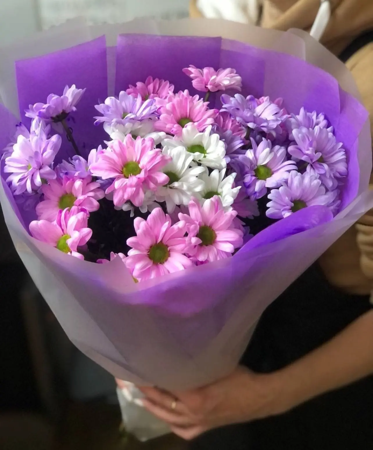Букет из розовых и фиолетовых кустовых хризантем — это не просто подарок, но и символ ваших чувств. Он станет прекрасным акцентом вашего торжества.