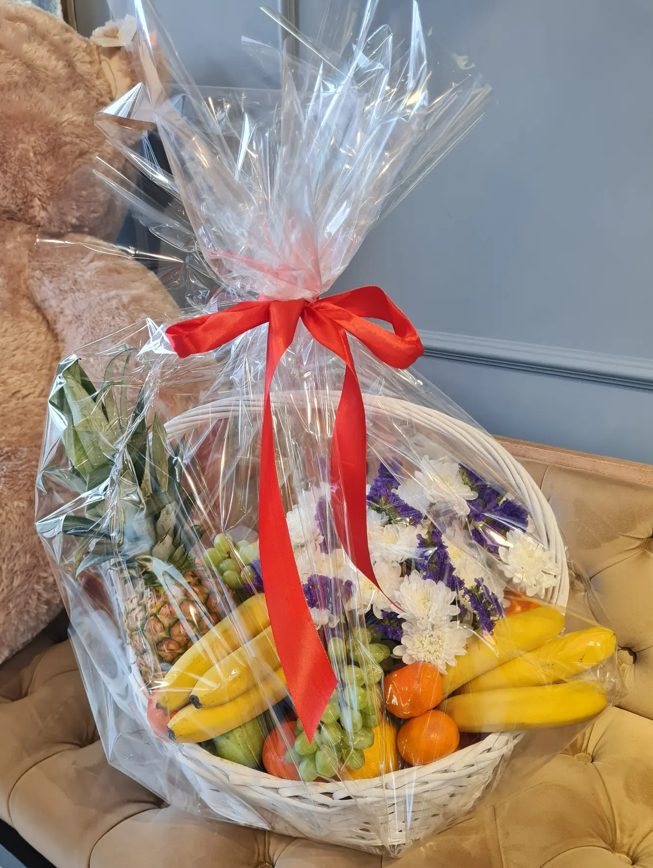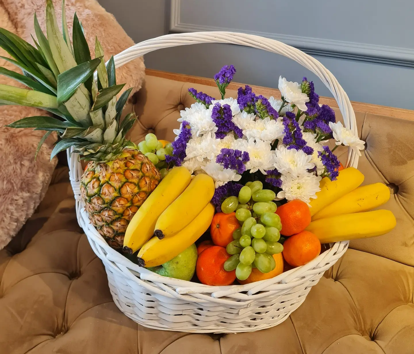 Виноград,бананы,апельсины,мандарины,ананас,яблоки, хризантемы, корзина |