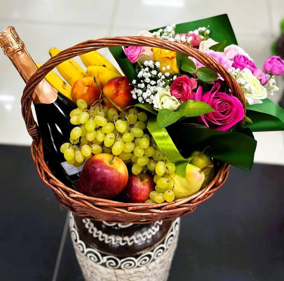 Состав: виноград. яблоки, бананы ,груши, напиток (по согласованию)+ цветы