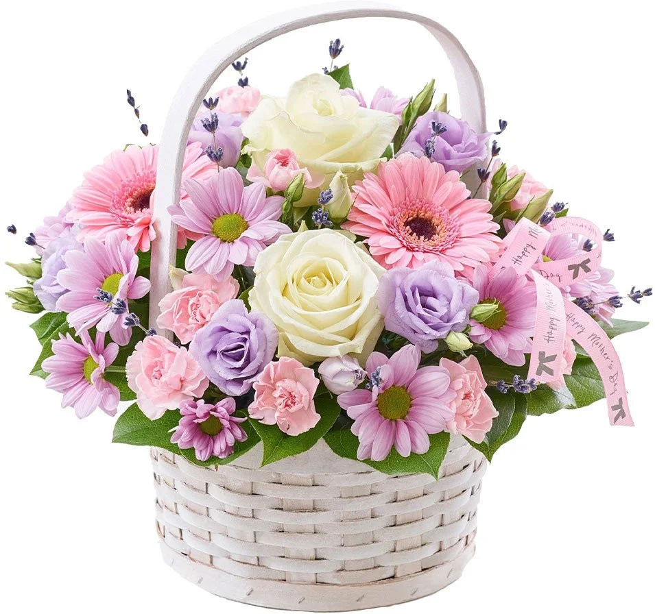 Состав: роза - 5 шт., гербера - 3 шт., эустома - 3 шт., кустовая хризантема - 5 шт., гвоздика - 5 шт., зелень, оазис, корзина