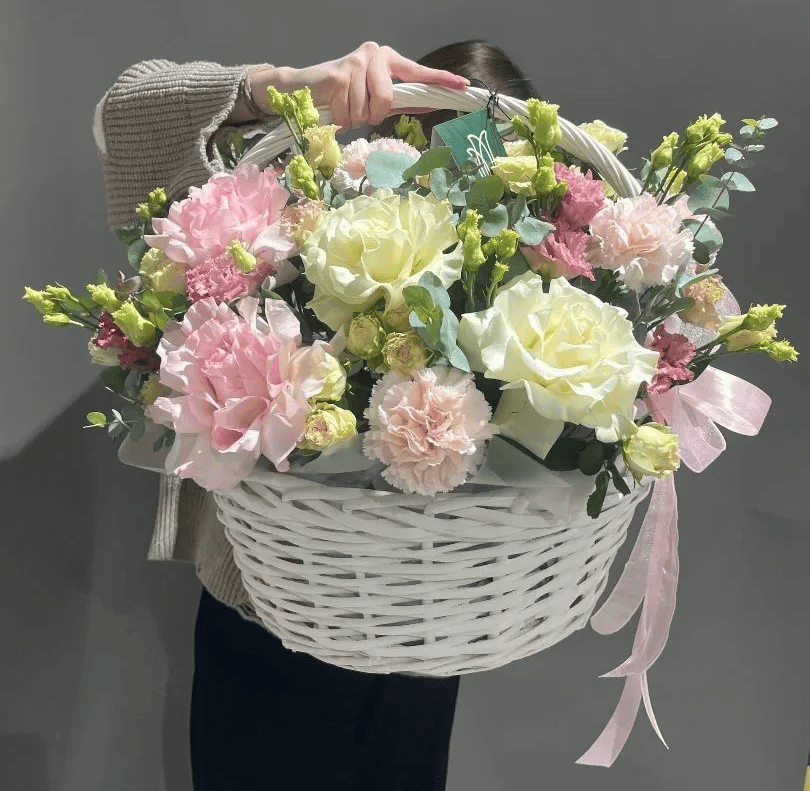 Корзина из роз и эустомы Иль-де-Франс