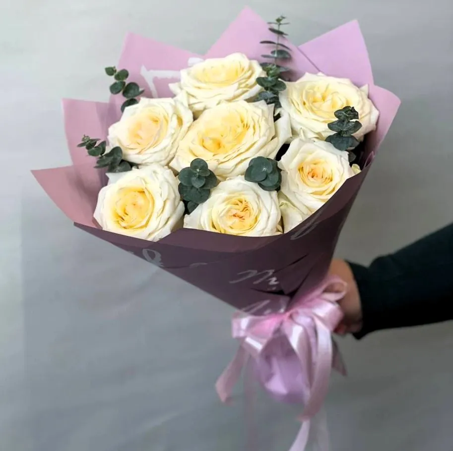- Стандарт - 7 роз, зелень, оформление, упаковка, лента
