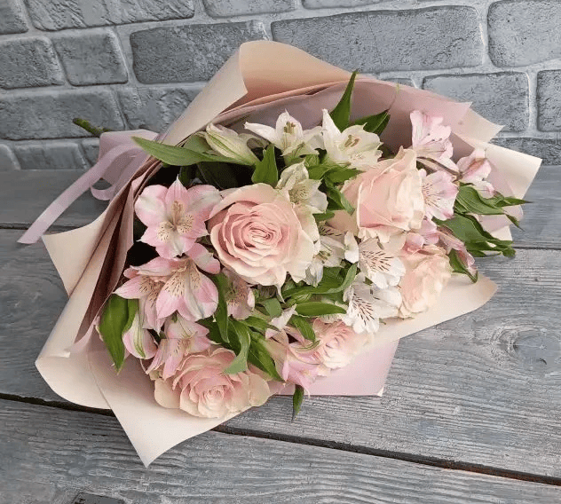Состав букета: розы, альстромерии, зелень, упаковка, лента