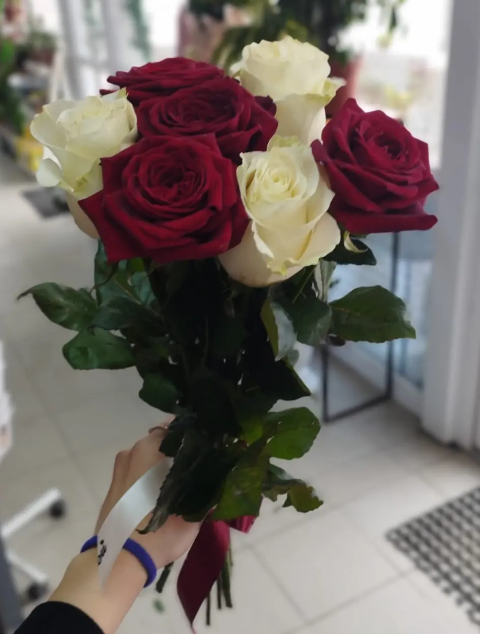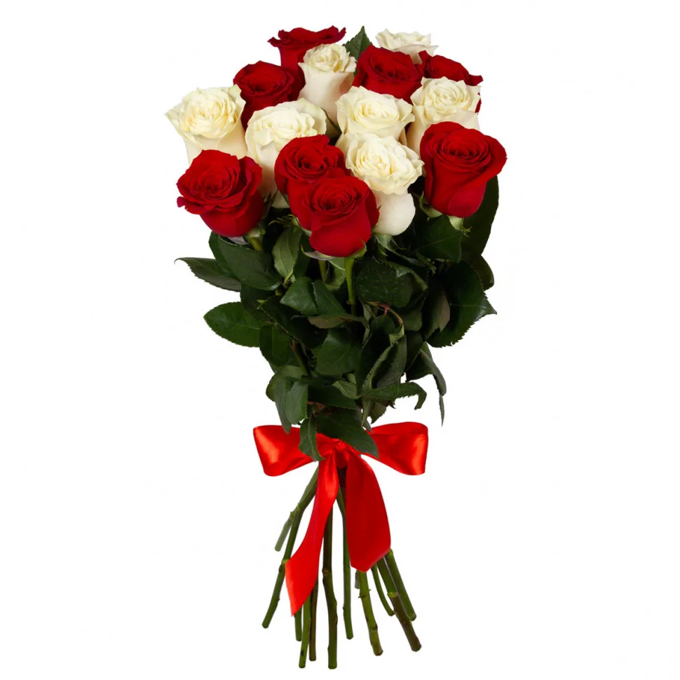 Состав букета: одноголовые розы - красные и белые, лента