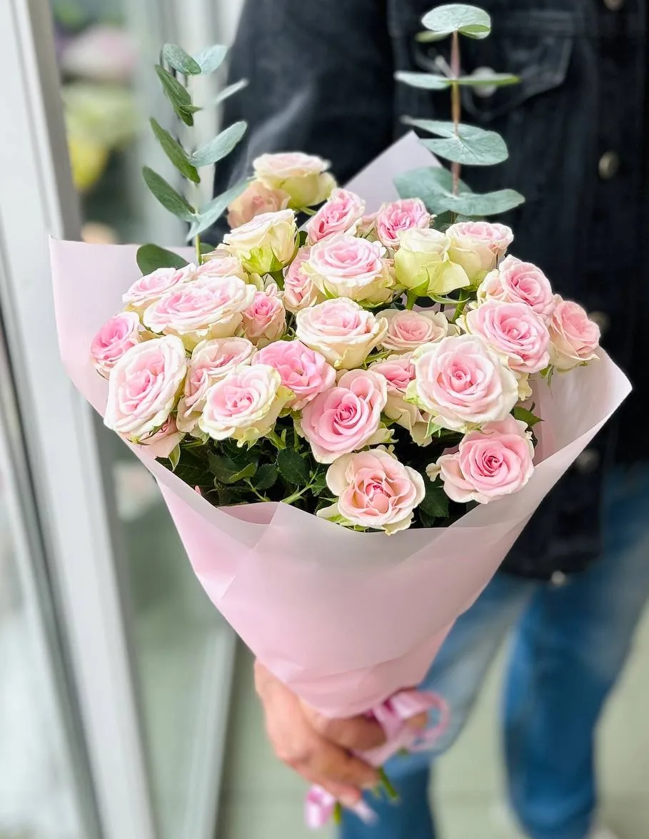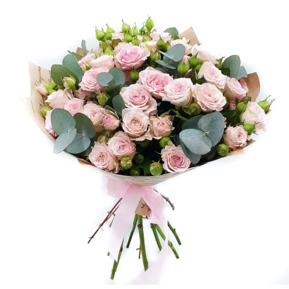 Состав букета : кустовые розы, зелень, упаковка,лента