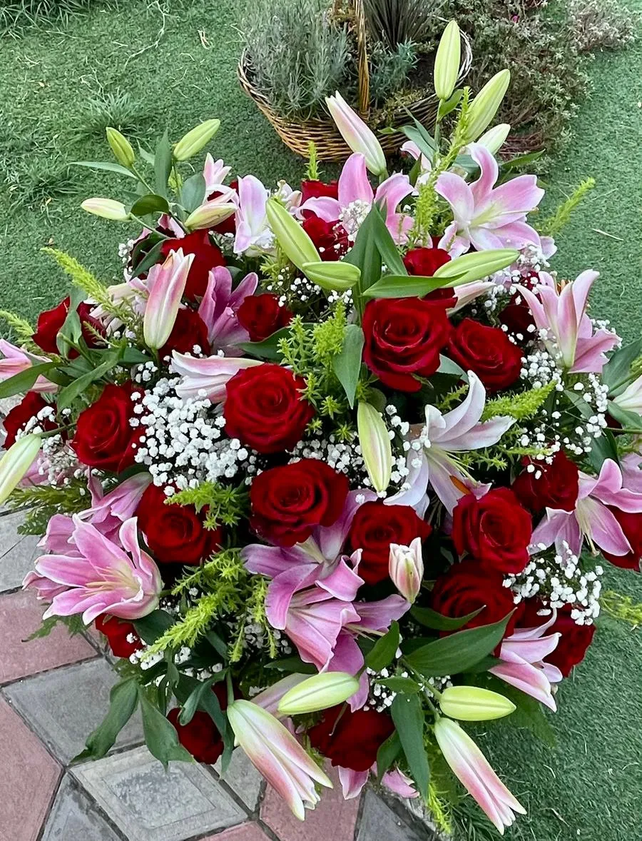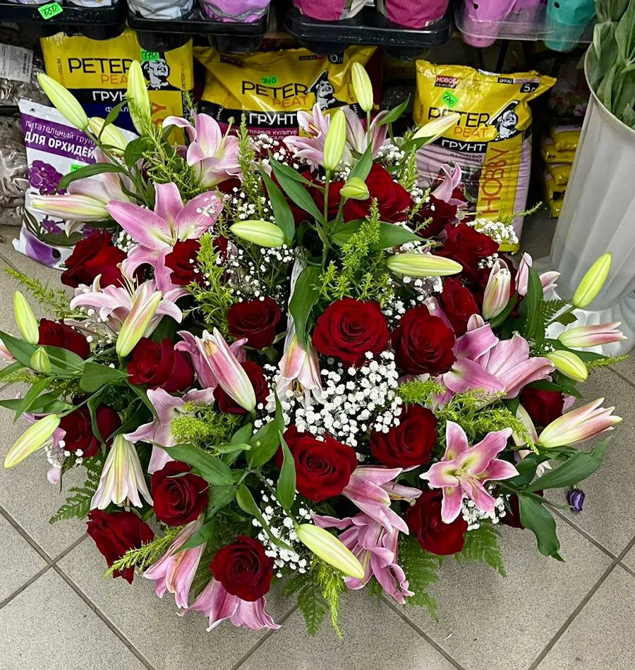 Лилия, Роза, Корзина, Оазис |