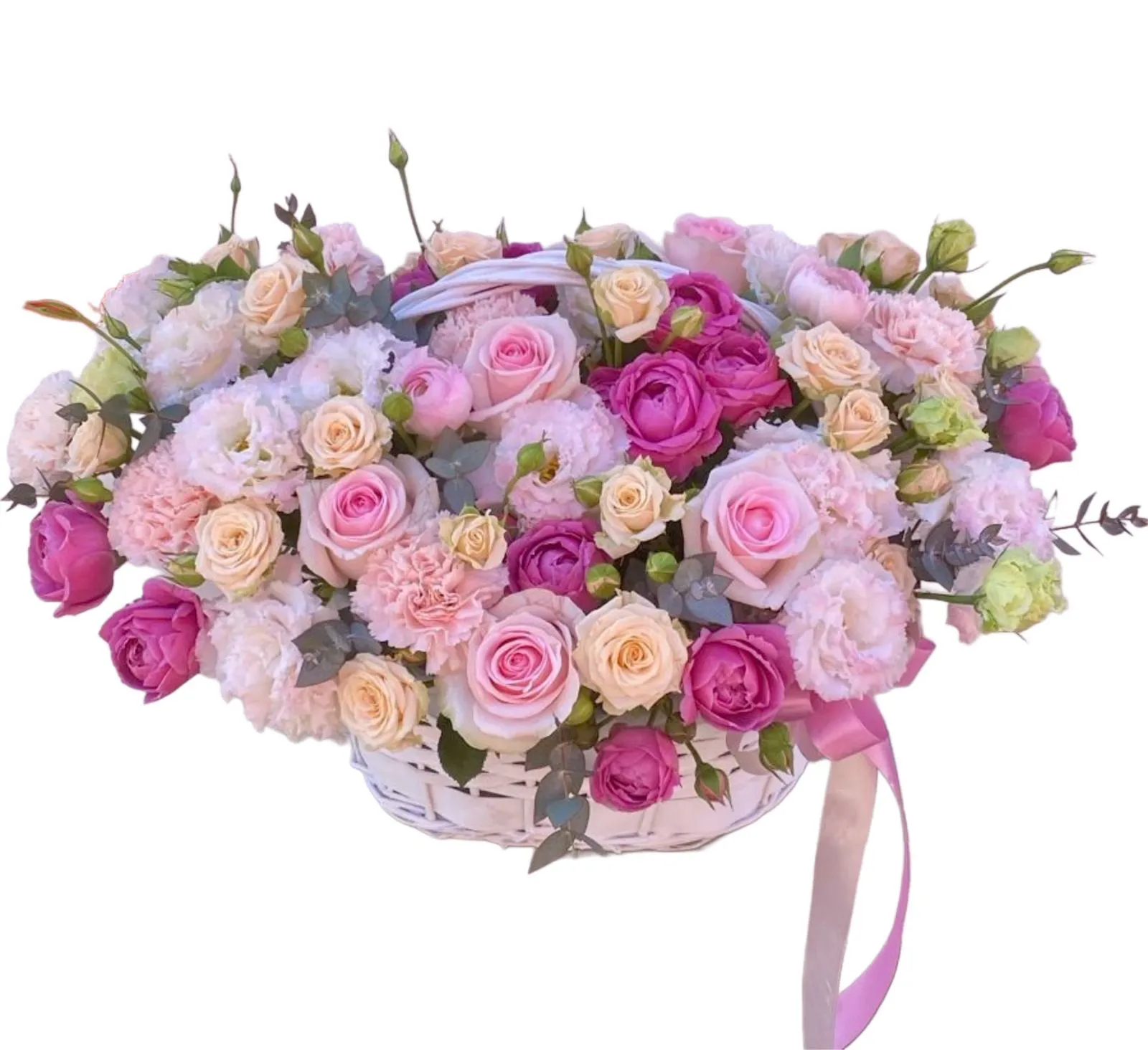 - Премиум - роза - 7 шт., пионовидная роза - 2 шт., кустовая роза - 6 шт., гвоздика - 4 шт., эустома - 4 шт., зелень, оазис, корзина