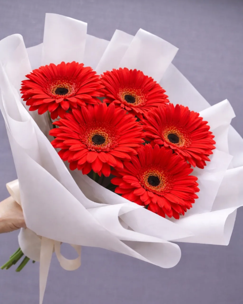 Яркий и выразительный букет из насыщенных красных гербер привлекает внимание своей энергией и глубиной цвета. Контраст с белой упаковкой подчёркивает сочность оттенков и придаёт композиции современный, стильный вид.