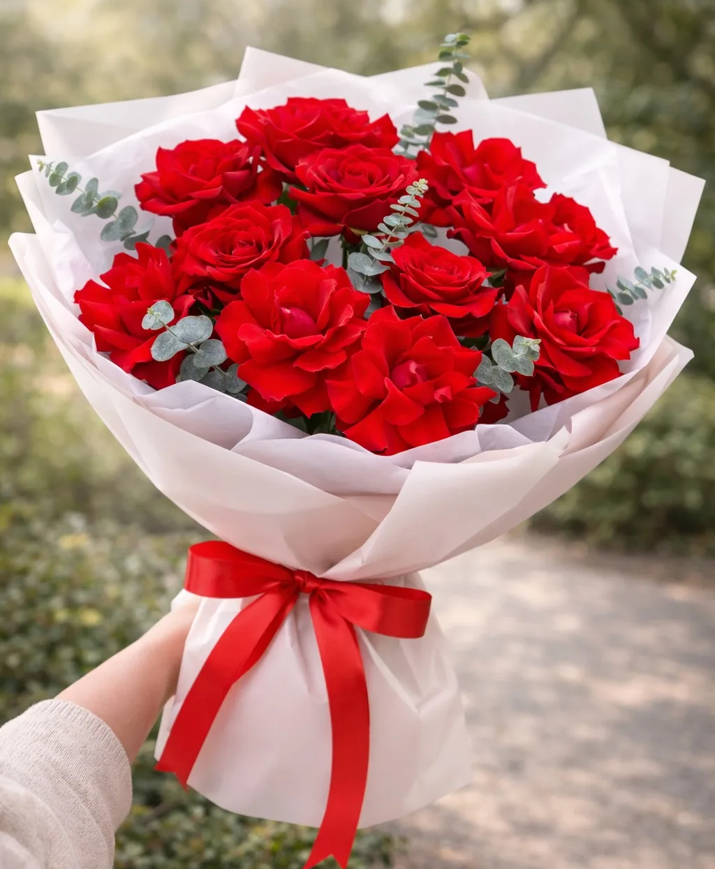 Свежий эвкалипт добавляет композиции лёгкость, природную гармонию и современный флористический стиль, подчёркивая глубину красных оттенков и делая букет более объёмным и воздушным.