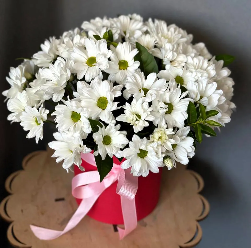 Такое оформление станет идеальным подарком для любого случая — будь то день рождения, юбилей или просто знак внимания. Шляпная коробка с белыми ромашковыми хризантемами вносит в атмосферу легкость и свежесть, напоминая о прекрасных мгновениях жизни и о том, как важно ценить каждый день.