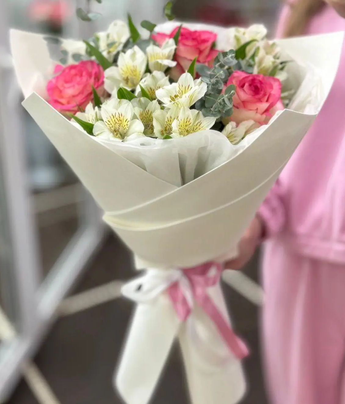 Изысканный букет, в котором гармонично сочетаются утончённые розы с их нежными розово-кремовыми лепестками, воздушная белая альстромерия и ароматный эвкалипт. Эта композиция словно создана для того, чтобы передать самые тёплые чувства — любовь, благодарность и искреннюю заботу.