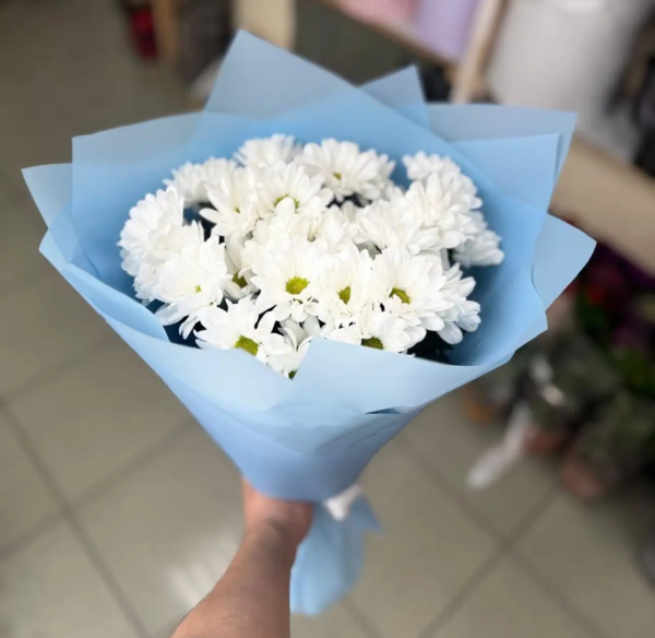 Светлый и воздушный букет из белой ромашковой хризантемы в голубой упаковке - символ чистоты, искренности и спокойной радости. Аккуратные белоснежные соцветия с нежной формой ромашек создают ощущение лёгкости и уюта, а свежий голубой оттенок упаковки придаёт композиции современный и стильный акцент. Такой букет выглядит просто и одновременно очень выразительно, подходя для тёплого комплимента, поздравления или приятного знака внимания.