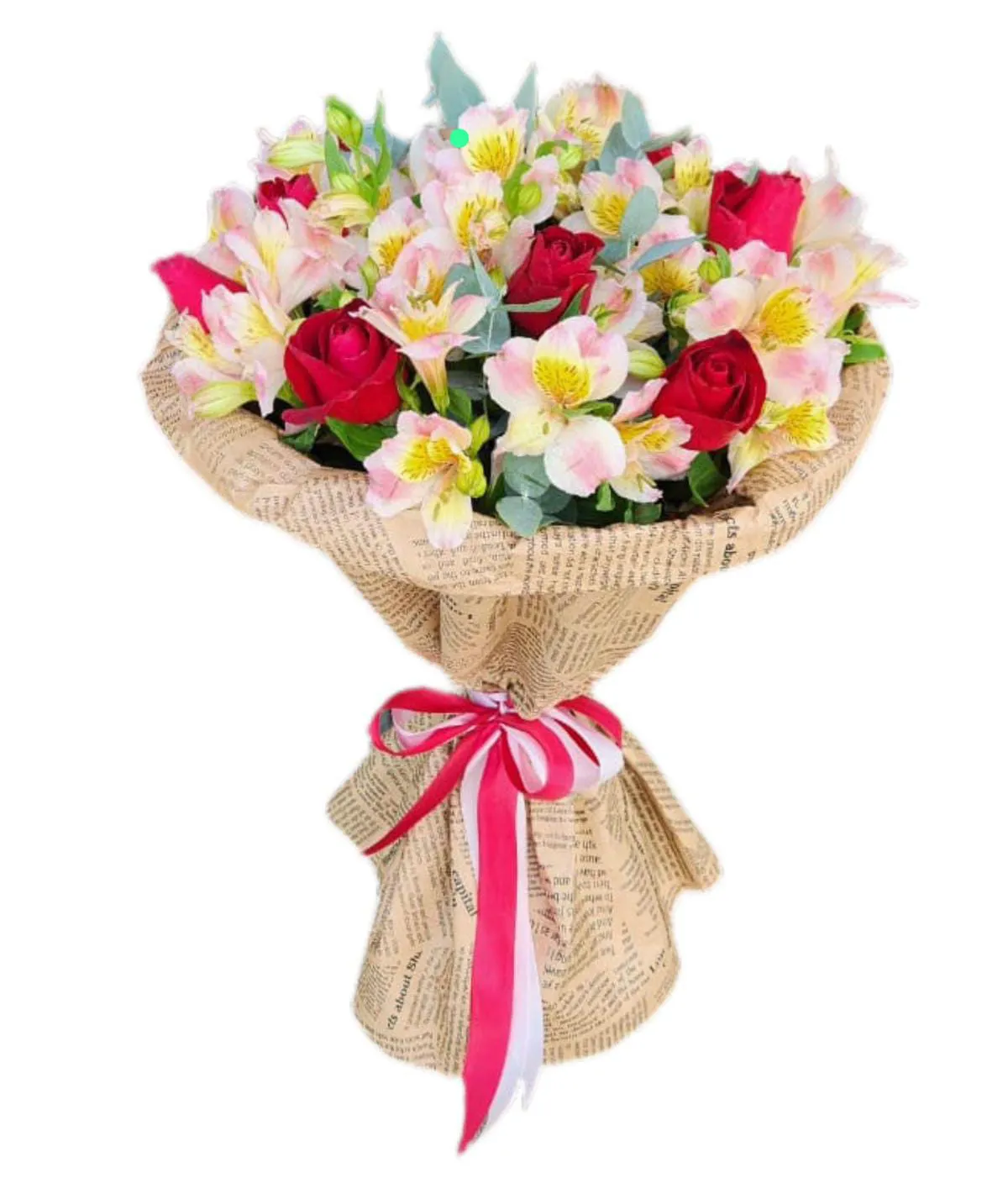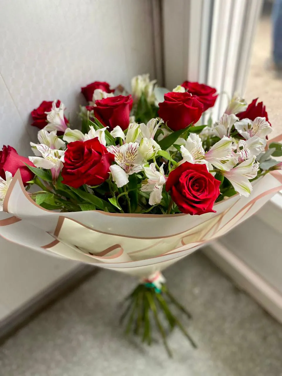 Состав букета: розы, альстромерии, зелень, упаковка, лента