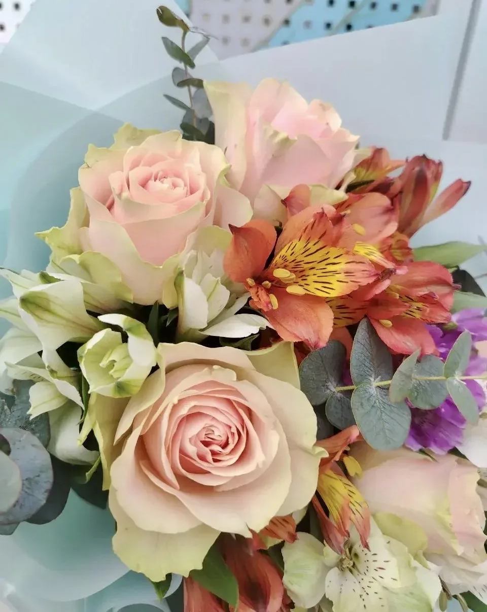 Нежный и в то же время яркий букет, в котором изящная нежно-розовая роза гармонично сочетается с белой, оранжевой и фиолетовой альстромерией. Такое сочетание оттенков создаёт живую и многогранную композицию, наполненную лёгкостью и настроением. Свежий эвкалипт добавляет букету природную утончённость и лёгкий аромат.