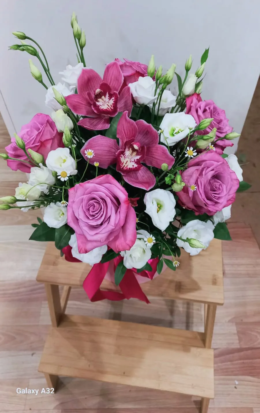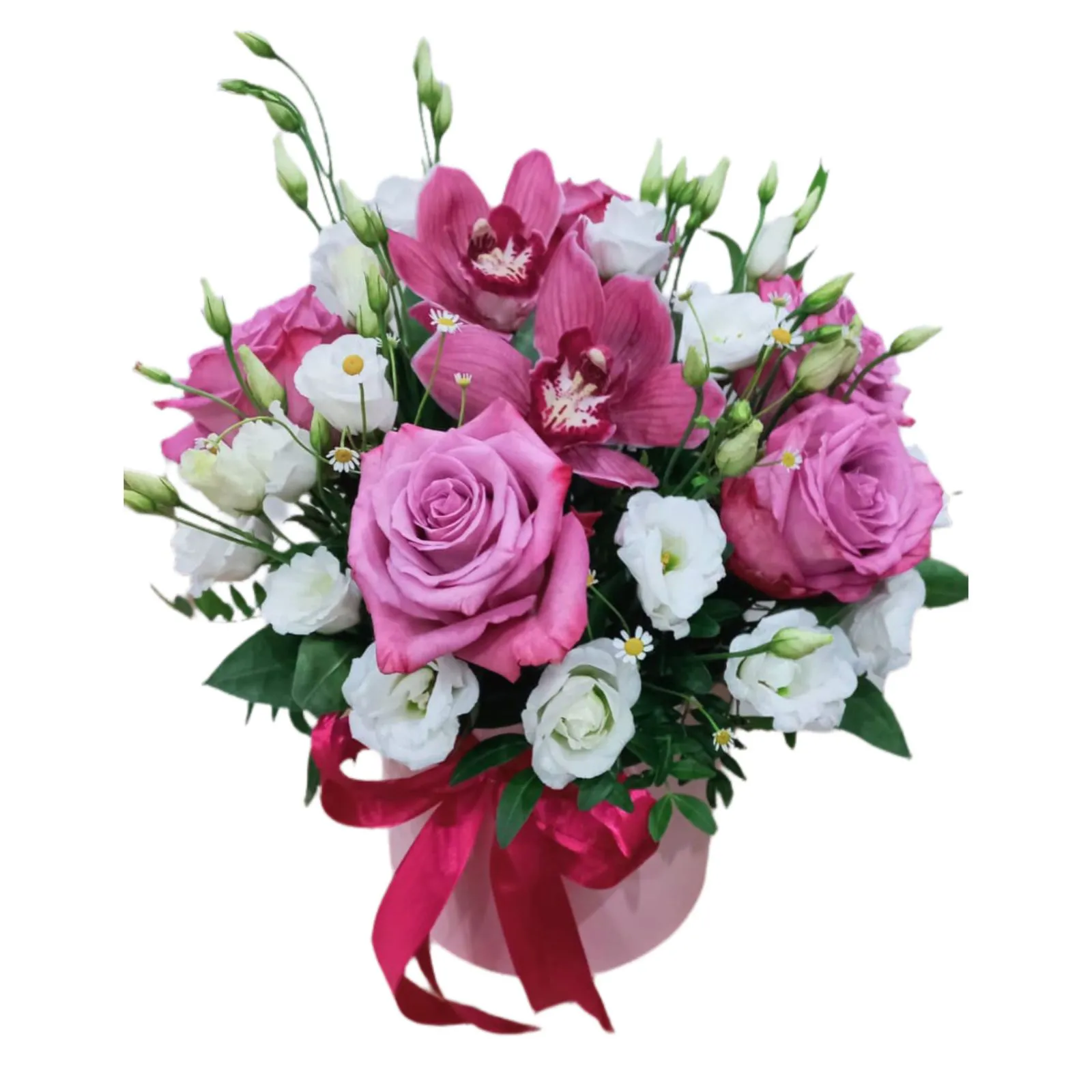 - Стандарт на фото (роза - 5 шт., орхидея - 2 шт., эустома - 3 шт., оазис, корзина)
