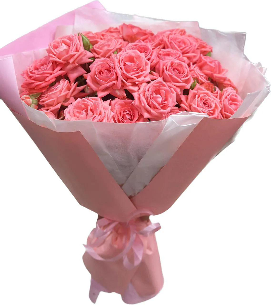 Кустовые розовые розы, упаковка, лента |
