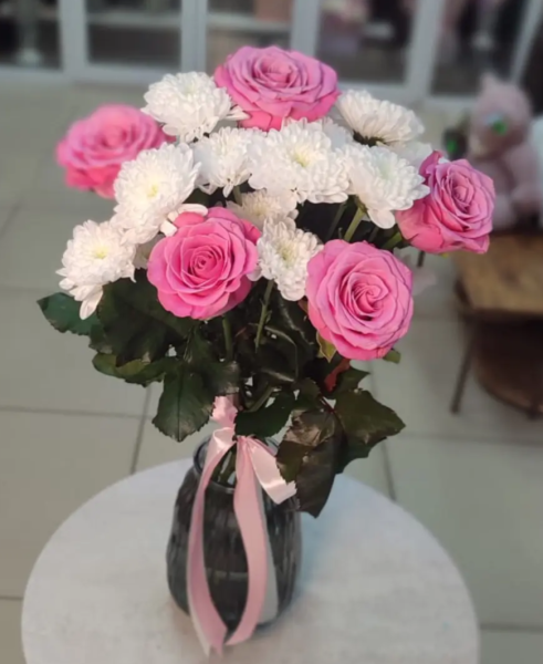 Нежный и утончённый букет, в котором гармонично сочетаются белые кустовые хризантемы и изящные розовые розы. Белоснежные хризантемы символизируют искренность и чистоту чувств, а розовые розы добавляют композиции нотки романтики, тепла и лёгкой мечтательности.