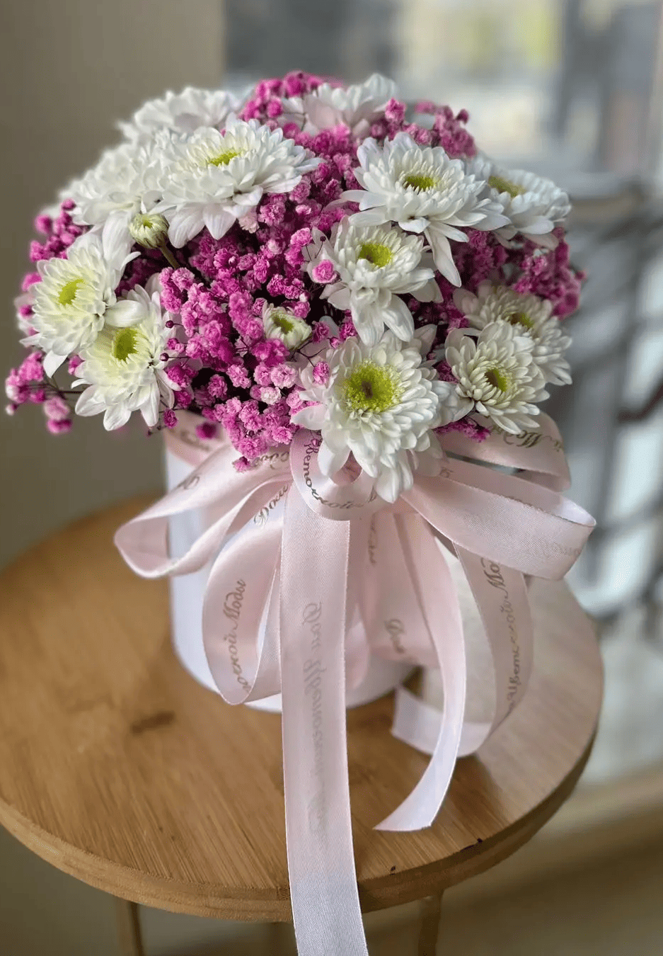 Нежная композиция в шляпной коробке из белой кустовой хризантемы и розовой гипсофилы - это сочетание утончённости, воздушности и изысканного стиля. Белоснежные хризантемы символизируют искренность, чистоту и добрые пожелания, а облако розовой гипсофилы добавляет композиции лёгкость, романтичность и особое очарование.