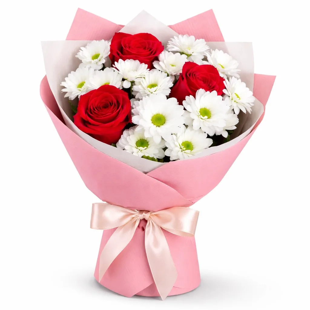 кустовая хризантема - 3 шт., роза - 3 шт., упаковка лента |