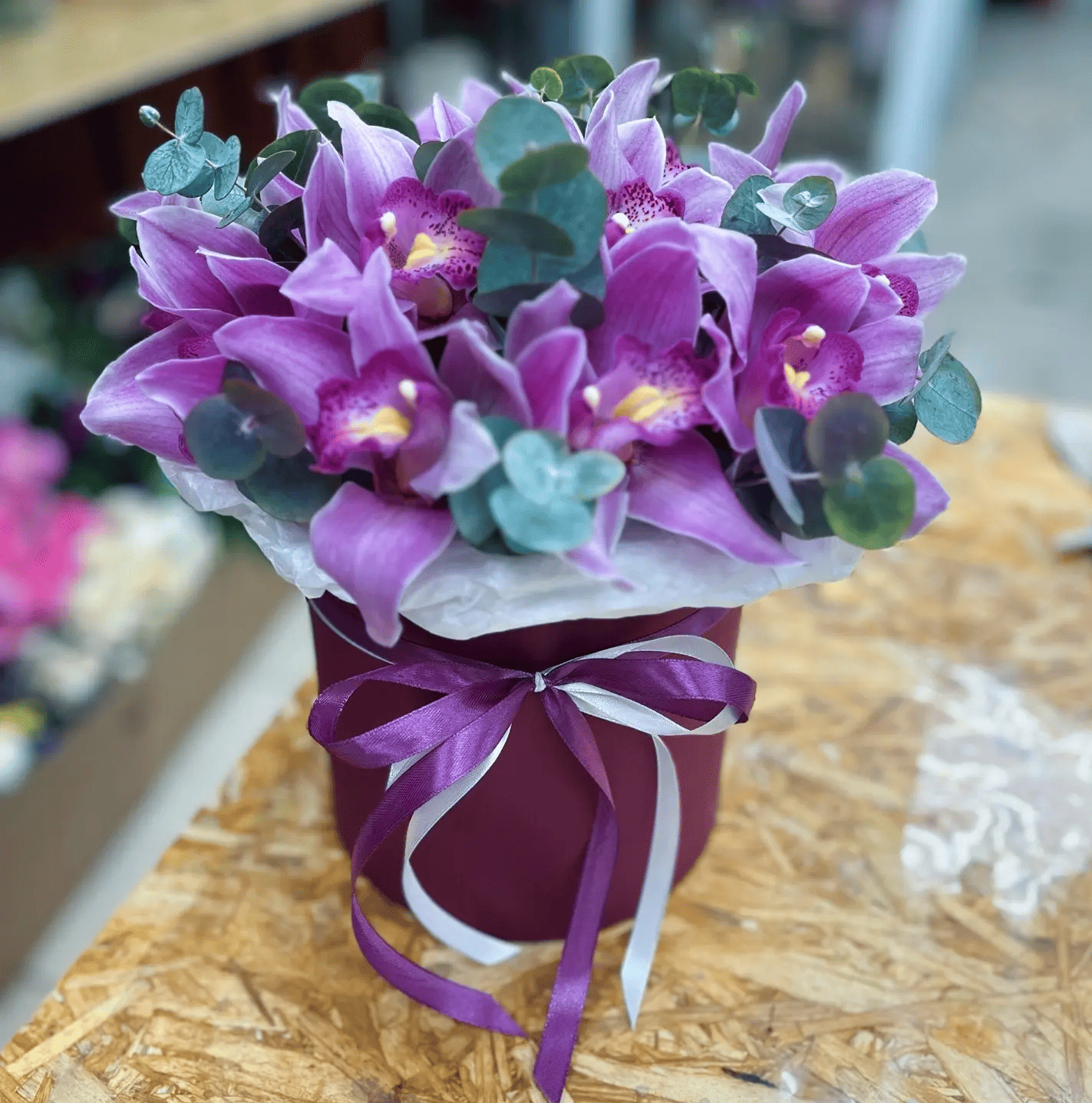 —Букет орхидей в шляпной коробке
