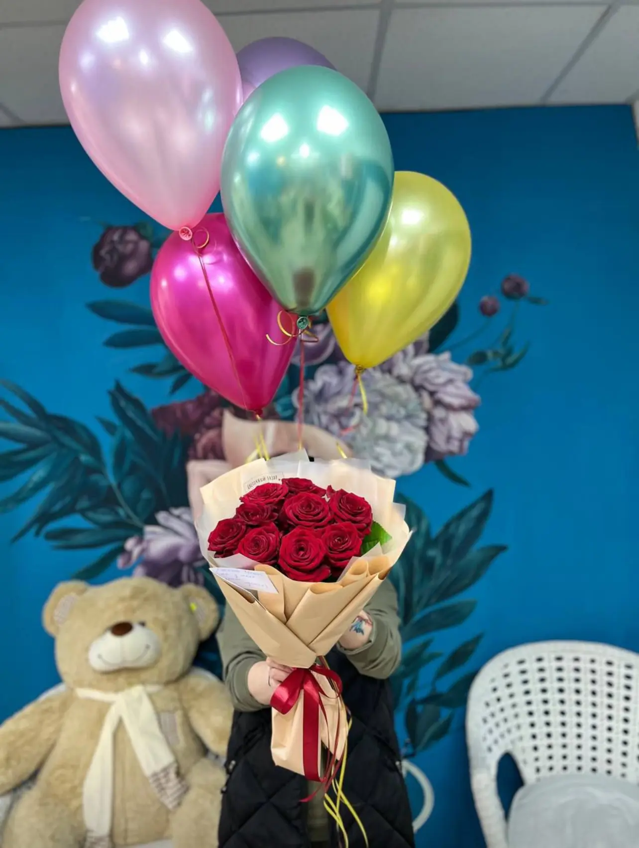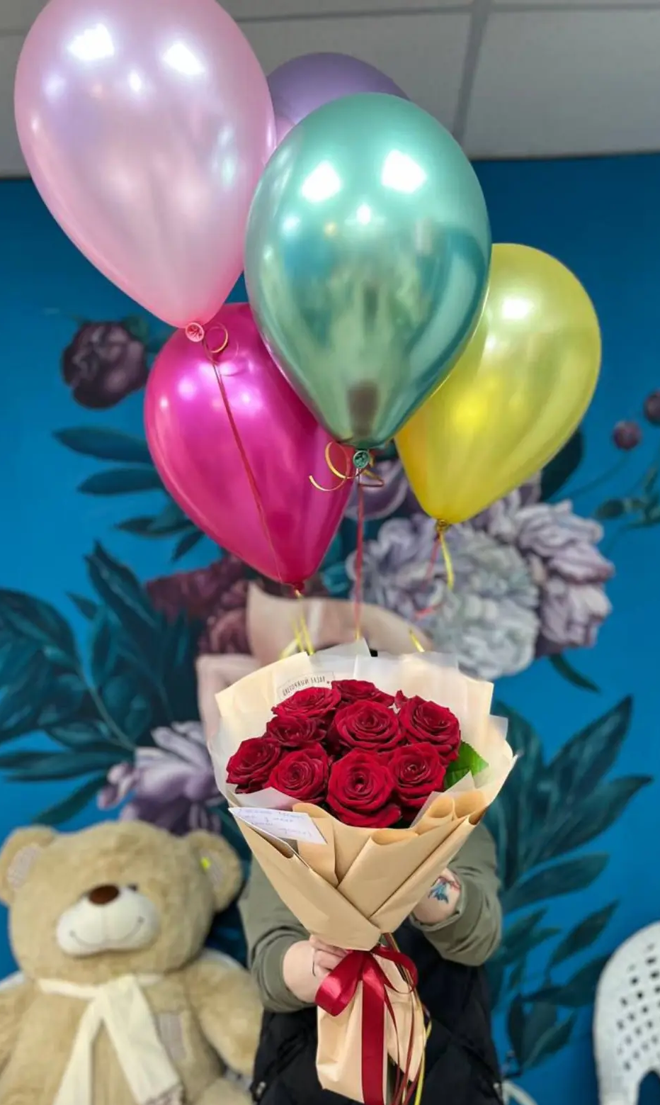 Роскошный букет из красных роз в сочетании с воздушными шарами создаёт атмосферу праздника и искренней радости. Идеальный подарок для любимых, друзей и близких — будь то день рождения, признание в чувствах или просто желание порадовать.