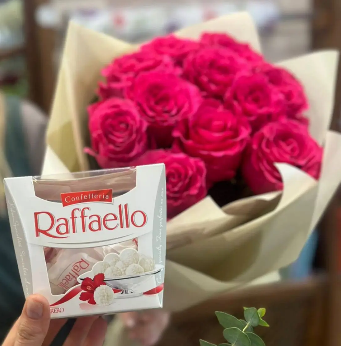 Букет из 11 малиновых роз с нежными конфетами Raffaello — идеальный подарок, чтобы выразить любовь, заботу и восхищение.