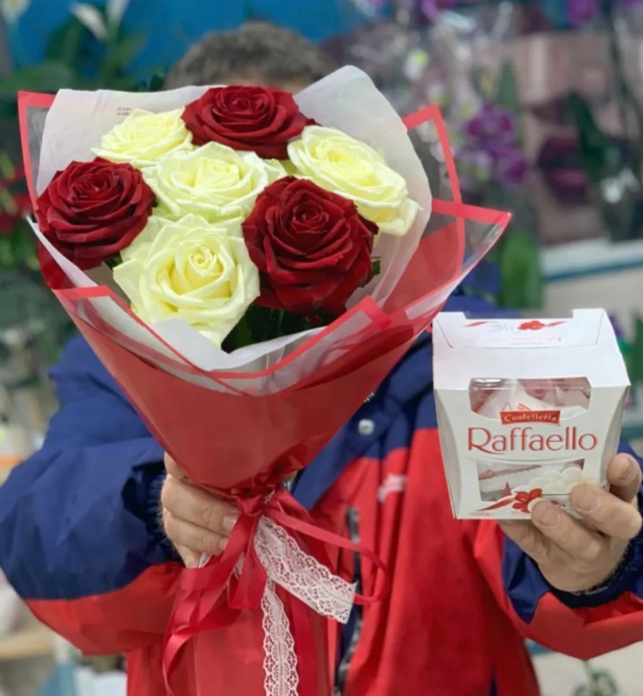 Элегантное сочетание страстных красных и нежных белых роз с изысканными конфетами Raffaello создаёт идеальный подарок для особых чувств. Ярко, красиво и со вкусом - чтобы по-настоящему порадовать близкого человека.