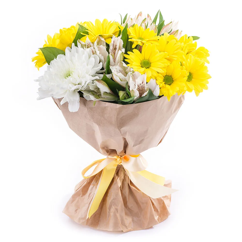 - Стандарт (хризантема желтая кустовая - 2 шт; хризантема белая - 1; альстромерия - 4 шт.; зелень; упаковка; лента)