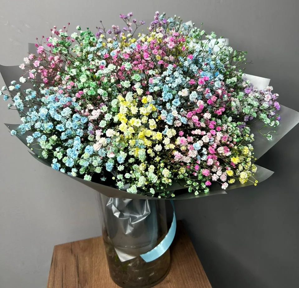 Представьте: нежные облачка невесомой гипсофилы, окрашенные во все цвета радуги. Этот букет – настоящий взрыв позитива и хорошего настроения! Он словно создан для того, чтобы дарить улыбки и делиться радостью.