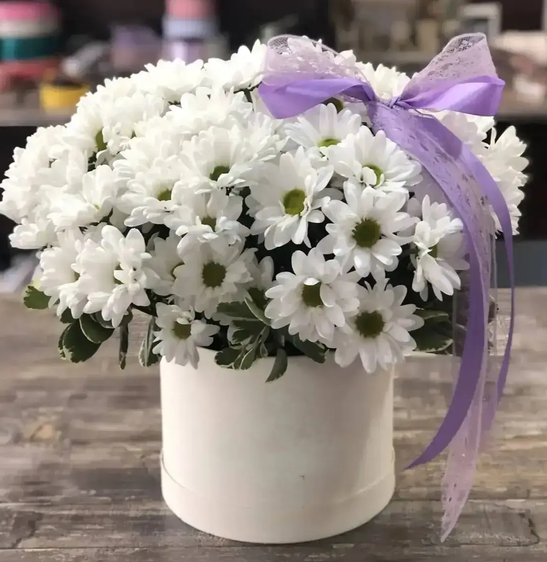 Не упустите возможность выразить свои эмоции с помощью этого прекрасного букета! Закажите шляпную коробку с белыми ромашковыми кустовыми хризантемами уже сегодня и подарите свою любовь и заботу в каждом лепестке!