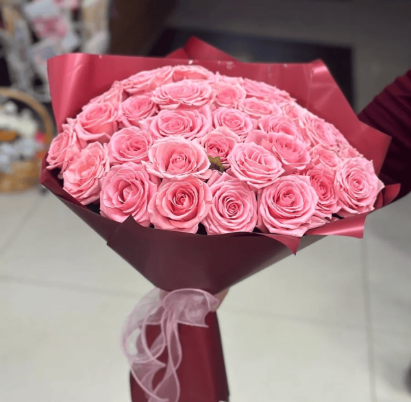 Пышная композиция из 25 свежих розовых роз покоряет с первого взгляда, создавая атмосферу романтики, тепла и искренних чувств.