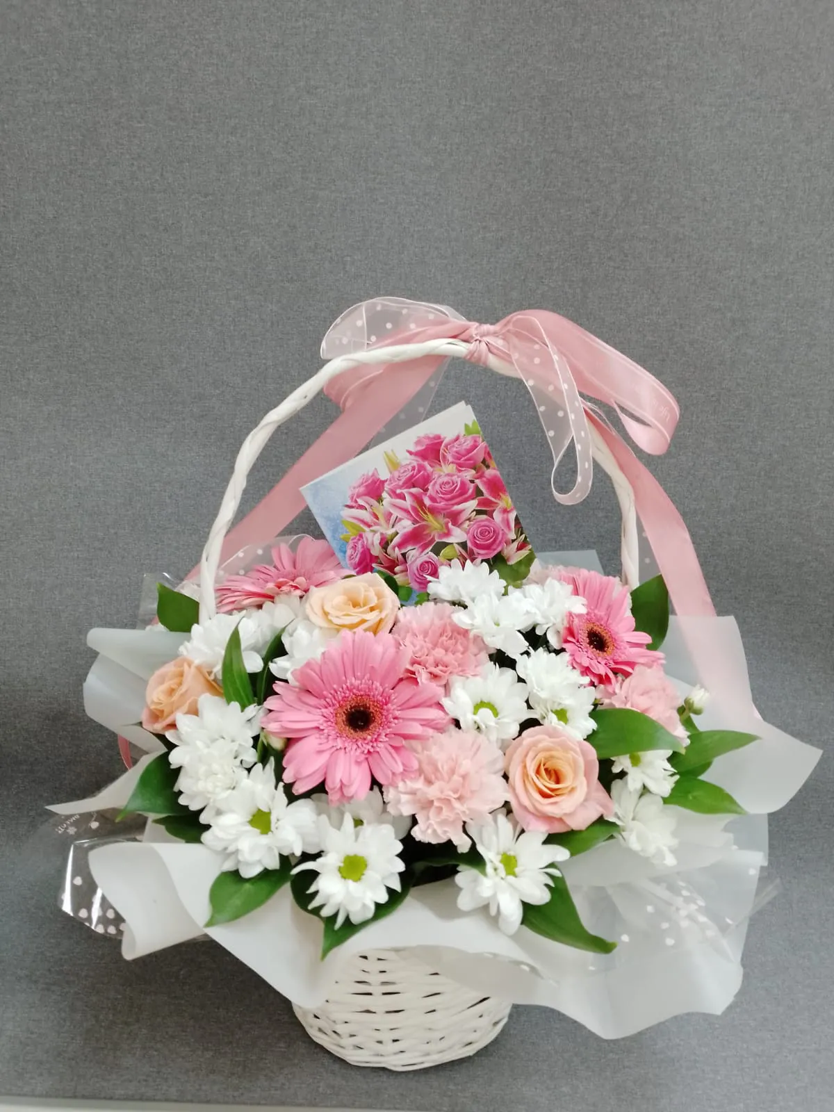 Эта композиция в корзине — настоящий праздник для глаз и души. Нежные кремовые розы, словно лепестки мягкого атласа, распускаются среди ярких розовых гербер, каждый из которых излучает энергии и радости. Гвоздики, с их изысканными формами и тонким ароматом, добавляют глубину и характер, создавая гармонию с белоснежными ромашковыми хризантемами, которые словно олицетворяют чистоту и невинность.