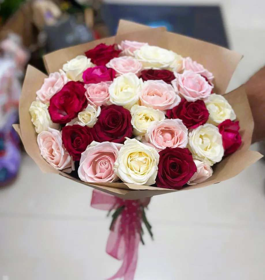 Букет из 31 разноцветной розы — это яркое воплощение эмоций и чувств, способное вызвать улыбку и радость у любого, кто его увидит. Каждая роза в этом элегантном букете наполнена уникальной историей и символикой. Они словно радуга, где каждый цвет рассказывает о своих чувствах: красные розы о страсти и любви, желтые — о дружбе и радости, розовые — о нежности и неживом восхищении, а белые — о чистоте и новых начинаниях.