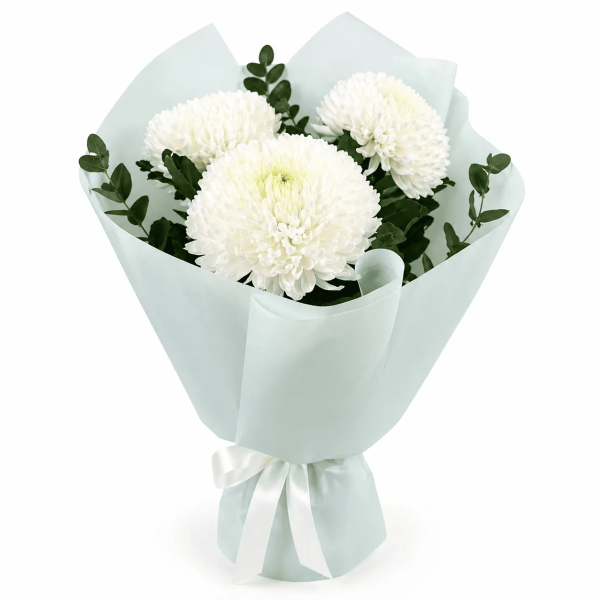 Букет из 3 белых одноголовых хризантем с эвкалиптом в голубой упаковке - это стильная и современная композиция, наполненная чистотой и спокойствием. Белые хризантемы символизируют искренность, добрые намерения и уважение, а эвкалипт добавляет свежести, природной гармонии и лёгкого ароматного акцента.