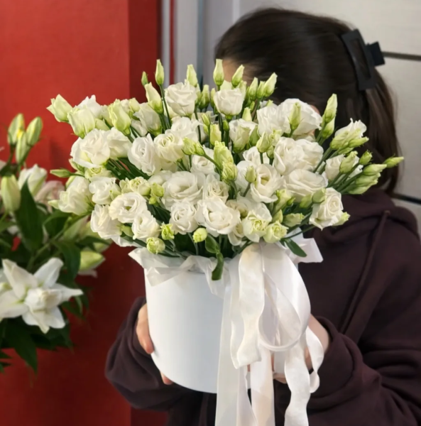 Изысканная композиция из 11 белых эустом в шляпной коробке - воплощение утончённости, нежности и природной гармонии.