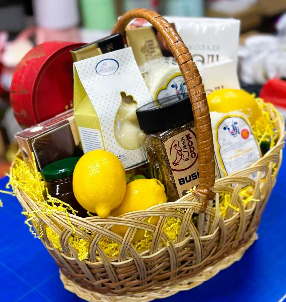 Состав: Сыр чечил -2 шт, сыр ,банка кофе, коробка зефира Шармэль-2 шт.,, коробка конфет КОРКУНОВ-1 шт., шоколад Бабаевский-2 шт., джем, лимоны,оформление