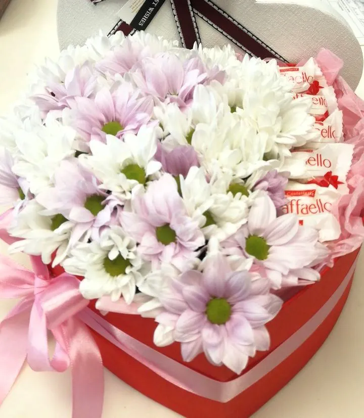 Когда речь идет о подарках, сочетание кустовых хризантем и конфет Рафаэлло в красивой коробке станет великолепным решением. Нежные цветы дополнят сладкие угощения, создавая гармоничное сочетание. Такой подарок подчеркнёт ваши чувства и сделает любой праздник особенным.